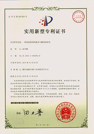 2005年8月取得“雙冷凝器完全熱回收熱泵機組”專利證書。