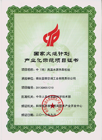 2013年9月榮獲國家火炬計劃證書(中、特高溫水源熱泵機組)。